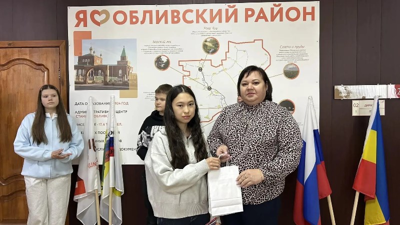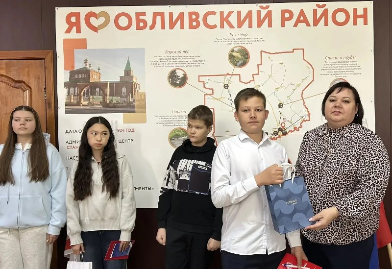 Так же каждый школьник получил экземпляр Конституции РФ, фирменную обложку на паспорт с символикой Движения Первых и памятные подарки от Территориальной избирательной комиссии Обливского района.